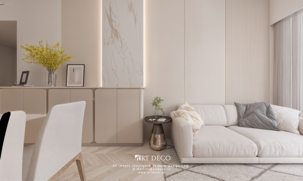 客飯廳設計整體色調以柔和的白色與米色為主,打造出明亮舒適的氛圍。