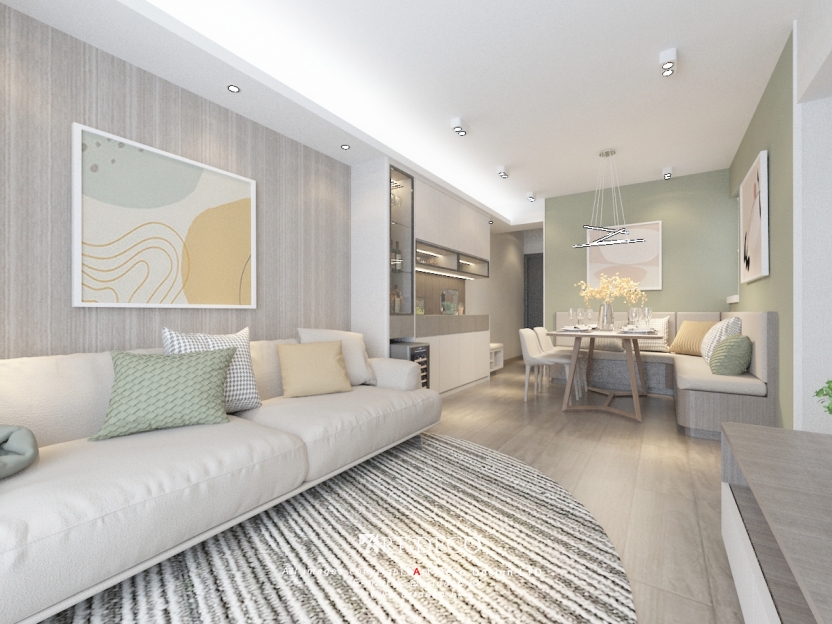 【薄荷綠刷出清新感 ! 簡約北歐風】設計師用上客戶家人喜歡的薄荷綠在飯廳區,看起來溫柔清新,散發一種優雅靜謐氣息,予空間溫暖療癒的感覺。傢俬以輕淺白搭襯溫煦木質、以搭佐些許深色木紋線提升細膩層次感。