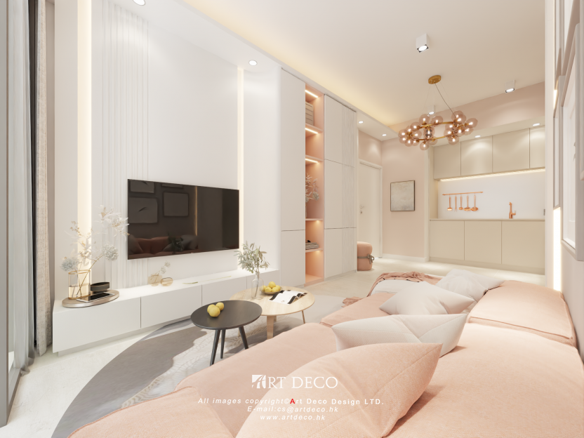 【美式浪漫的粉白空間,打造你專屬的溫柔生活風格!】設計展現女戶主喜歡溫柔優雅的美式風格。整體以白色與粉色為主色調,打造出清新又浪漫的氛圍。客廳牆身是奶白色,搭配隱藏式燈光設計,讓空間顯得更加柔和溫暖。
