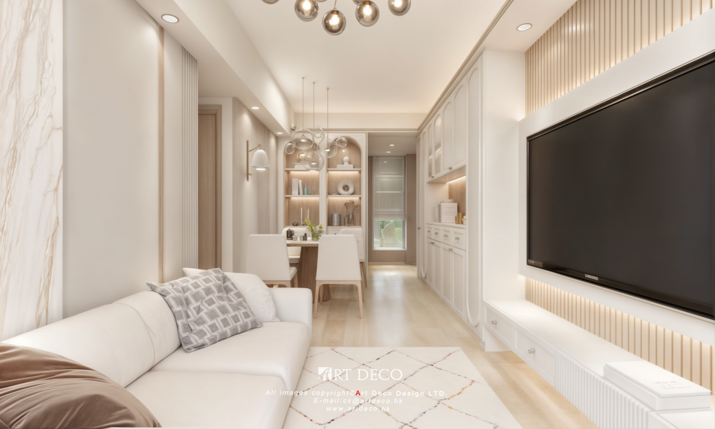 設計師以輕法式配以輕柔的奶油色系演繹,飯廳位對稱圓拱展示櫃,再以溫潤木材質及邊框勾勒,挹注在明亮的空間充滿細膩的質感細節。