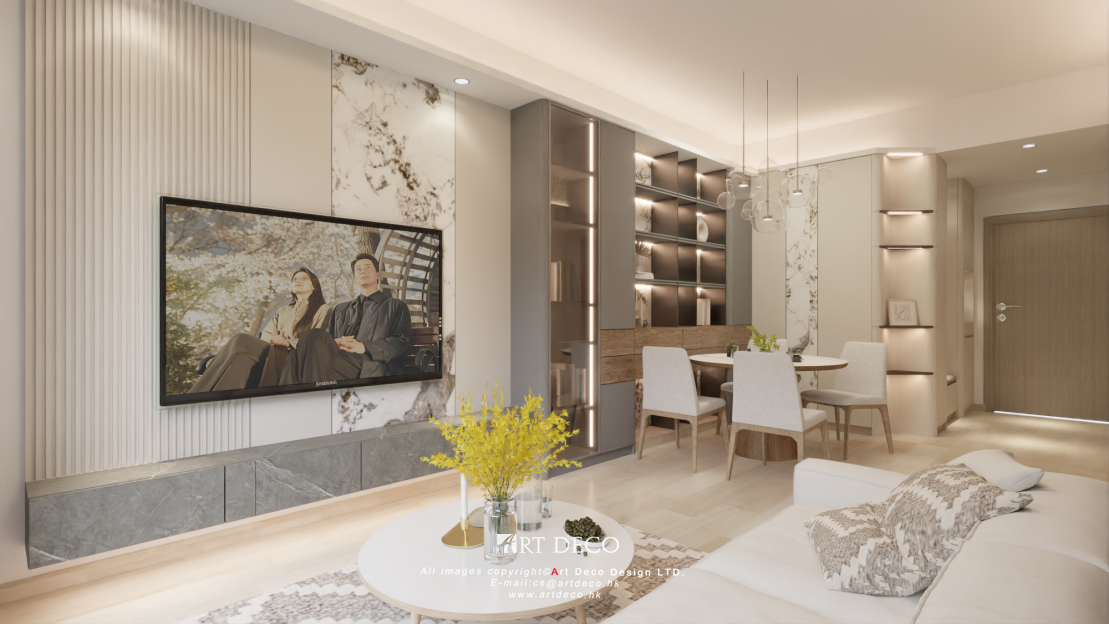設計師選擇輕柔的大地色為基調,結合櫃與牆身的不同材質變化,美型收納展示,令空間豐富層次感。